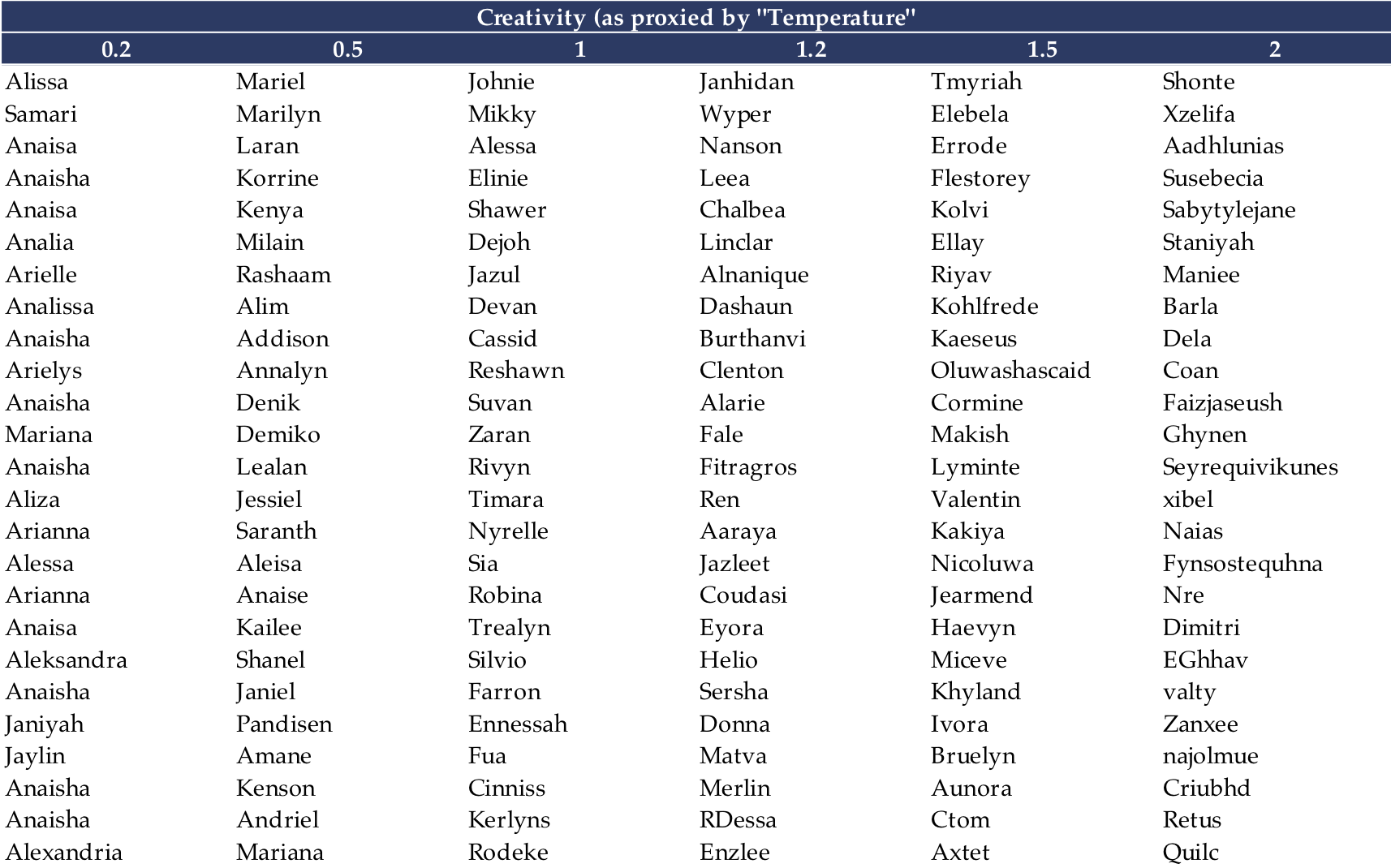 Each column contains 25 sampled names from the trained RNN segmented by varying degrees of creativity as proxied by the parameter Temperature in the model. In other words, the lower the creativity (further to the left) the more recognizable the name.