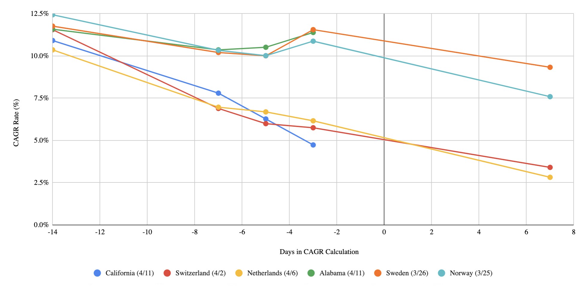 Given I'll be the first to admit this chart could be a little confusing, note that the X-axis reflects the amount of days used in the CAGR (Compound Annual Growth Rate) calculation. For instance, -3 days correlates to the 3-day CAGR of COVID cases as of the date of each country in the legend. Another example, 7 days correlates to the CAGR of COVID cases 7 days after the date in the legend (hence California and Alabama don't have predictions given I finished this on 4/12/2020)