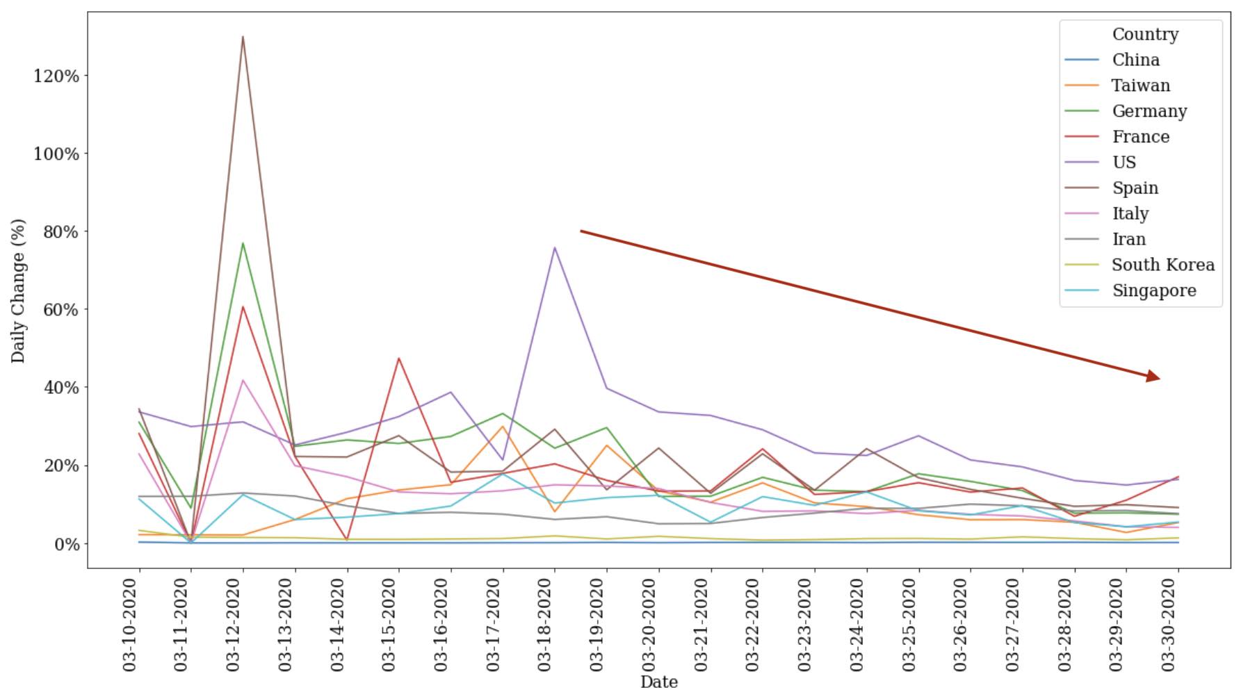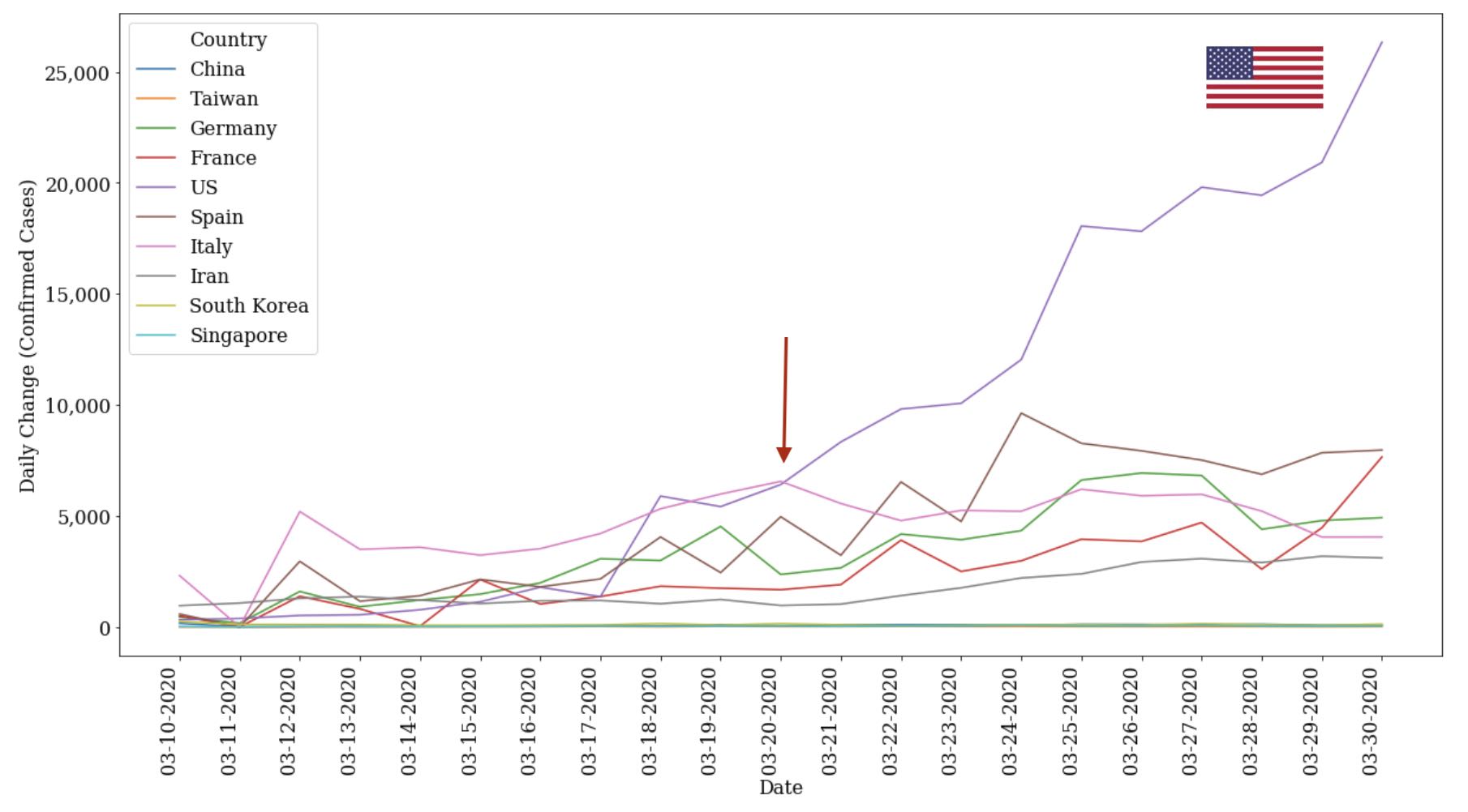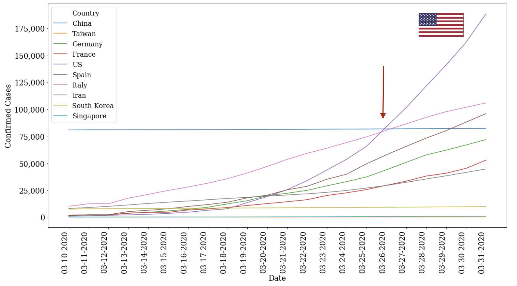 - While Italy was the focus of the news, we can see that the slope of the USA's curve was lurking in the shadows and quickly bends to close the gap starting in early-to-mid March.
