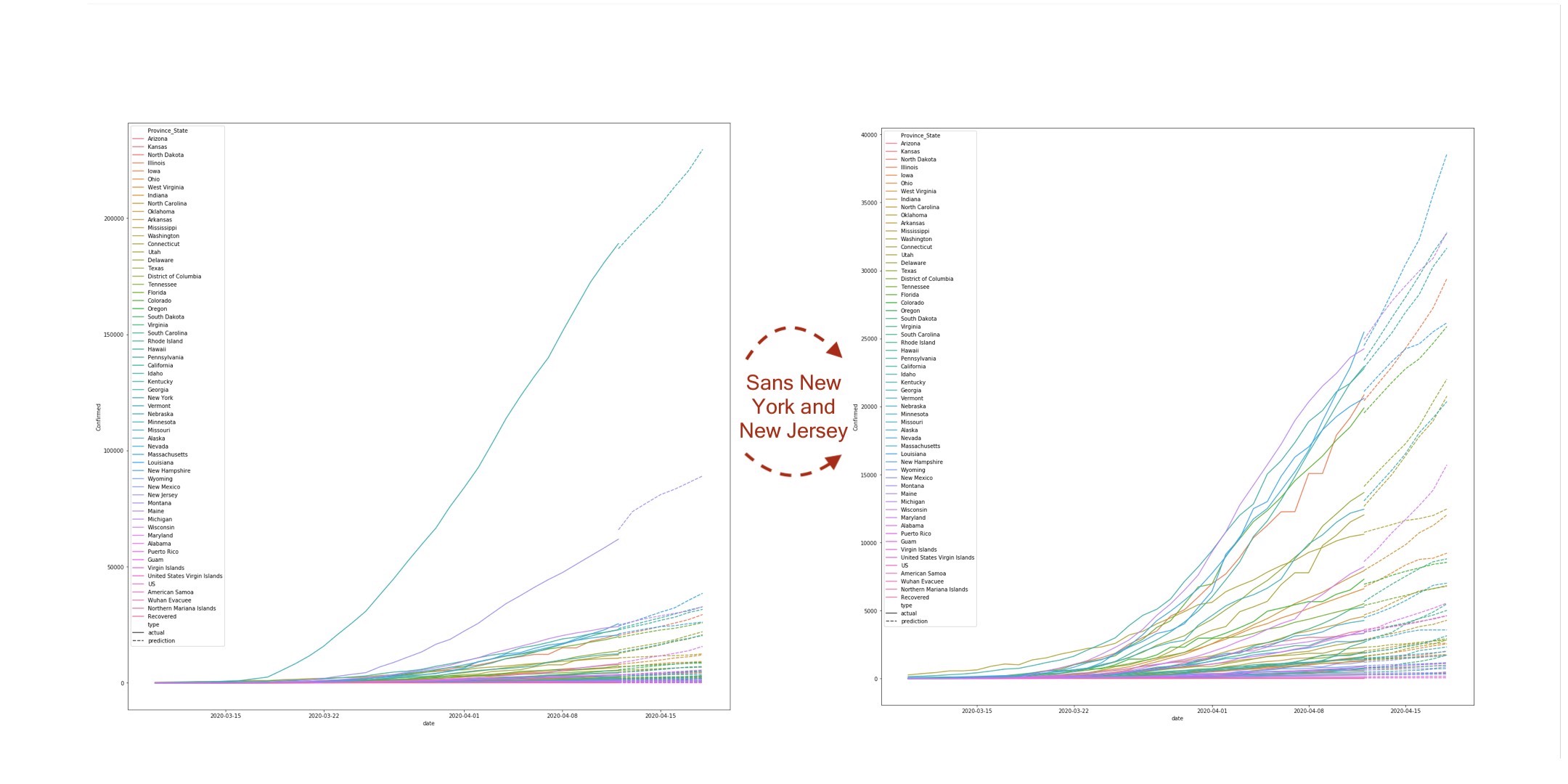 - This growth is largely attributed to not just the more densely concentrated hot beds like New York but the also the growing centers all around the country. As an example, look how over 5 states will surpass 30k in the coming days in the right graph that removes New York and New Jersey (lots of text... so best to just zoom in for general details).
